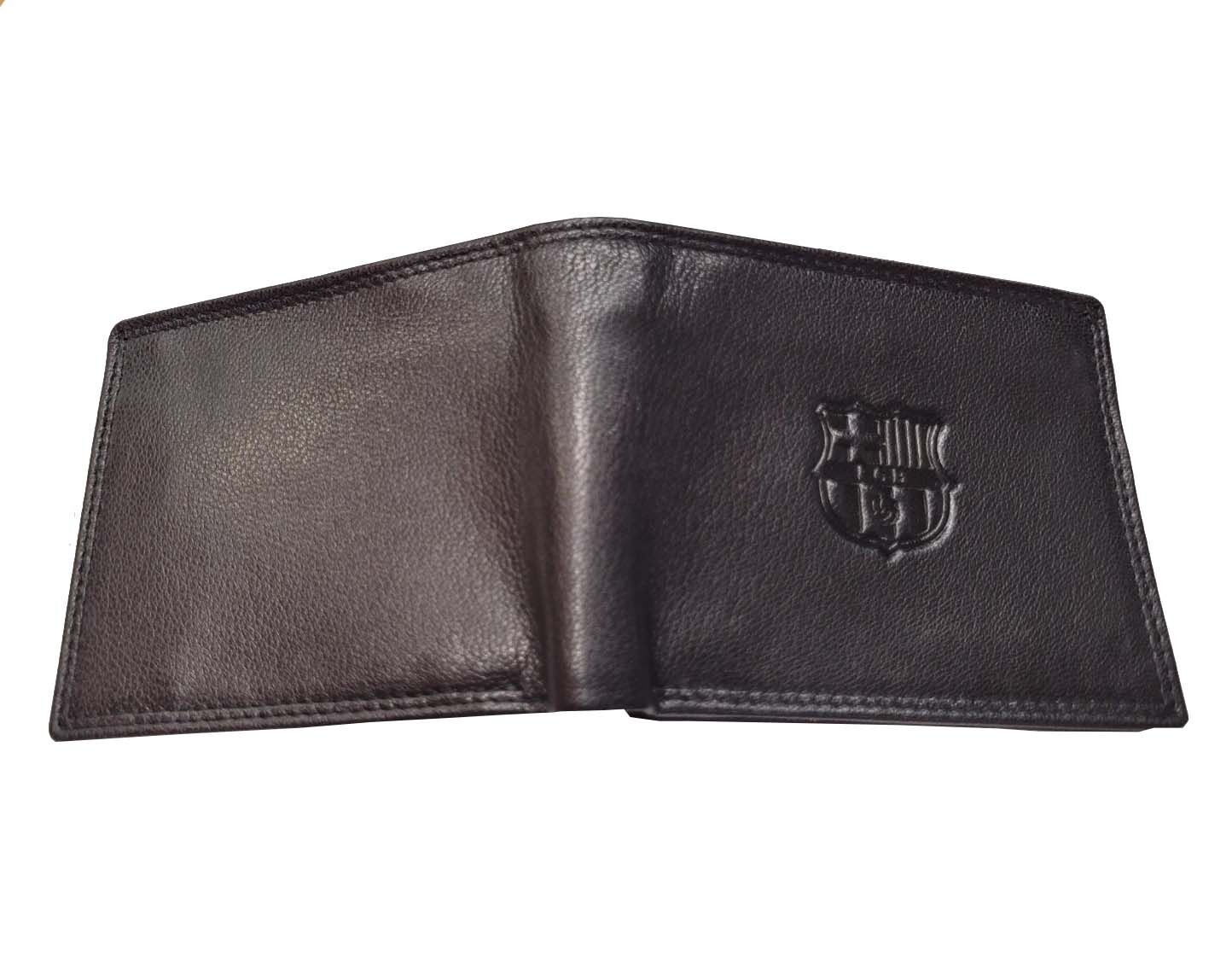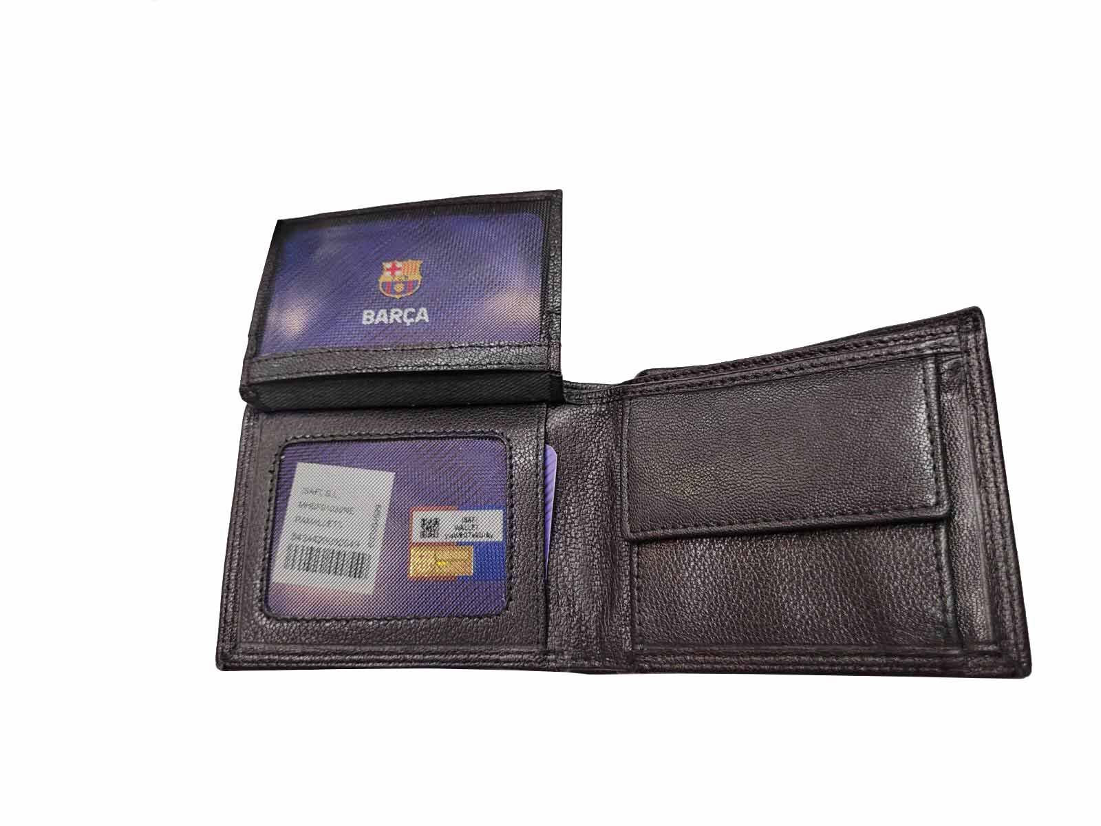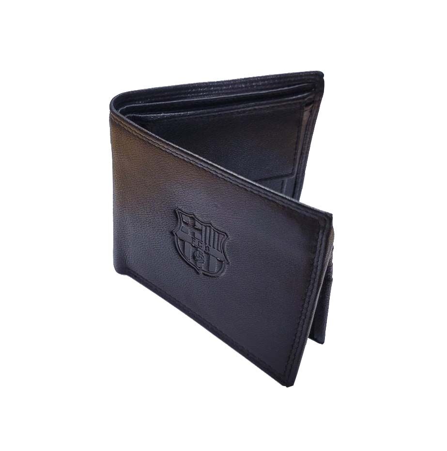 Черен кожен портфейл на Барселона с отпечатана емблема.