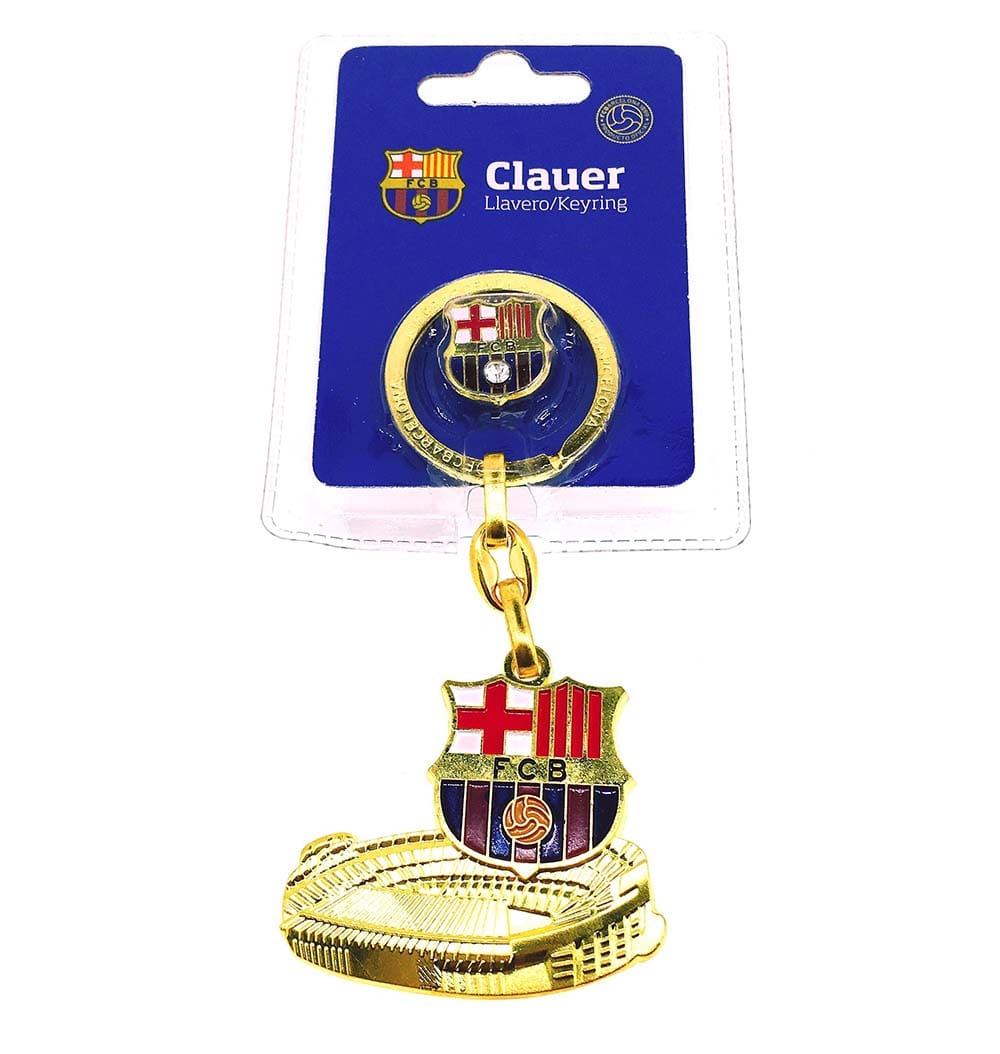 Комплект златист ключодържател на Барселона с емблема и малък макет на стадион и значка .