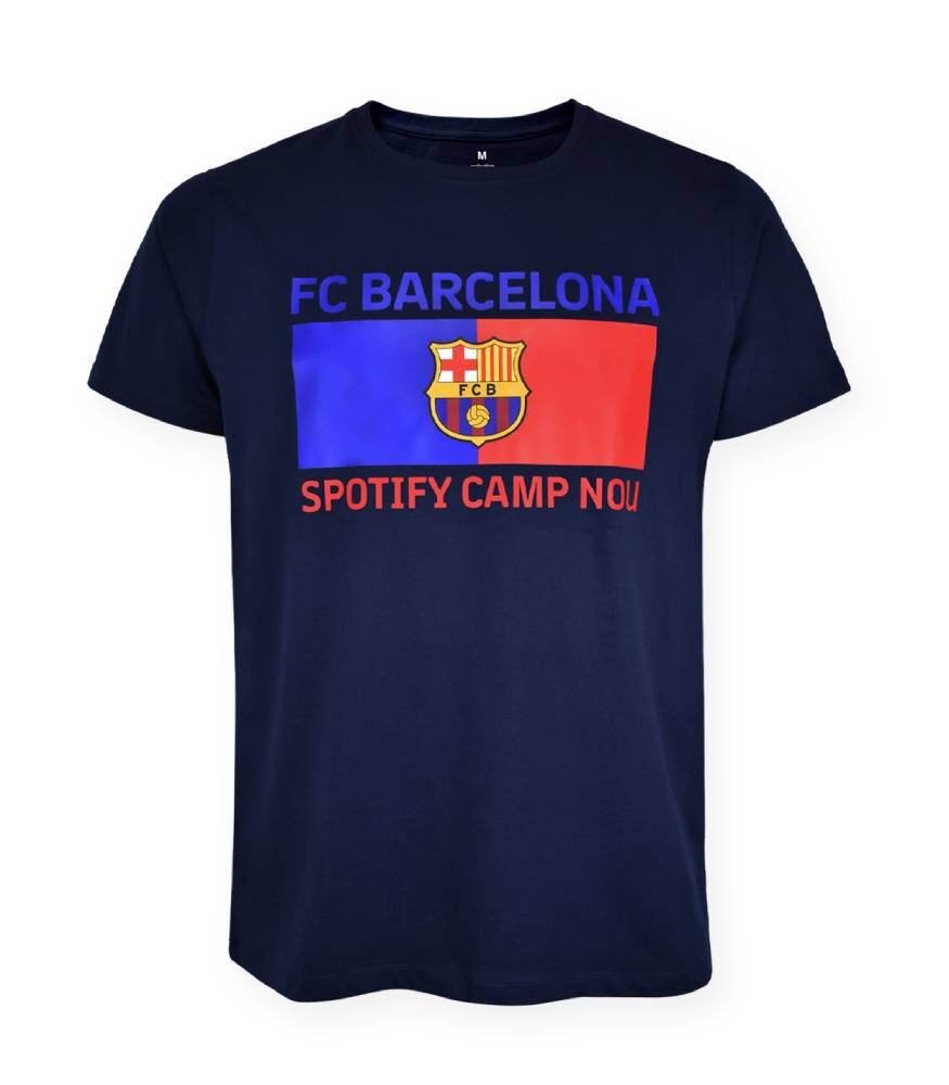 Тениска на Барселона с емблема на синьо/червен фон и надпис Спотифай Камп Ноу.