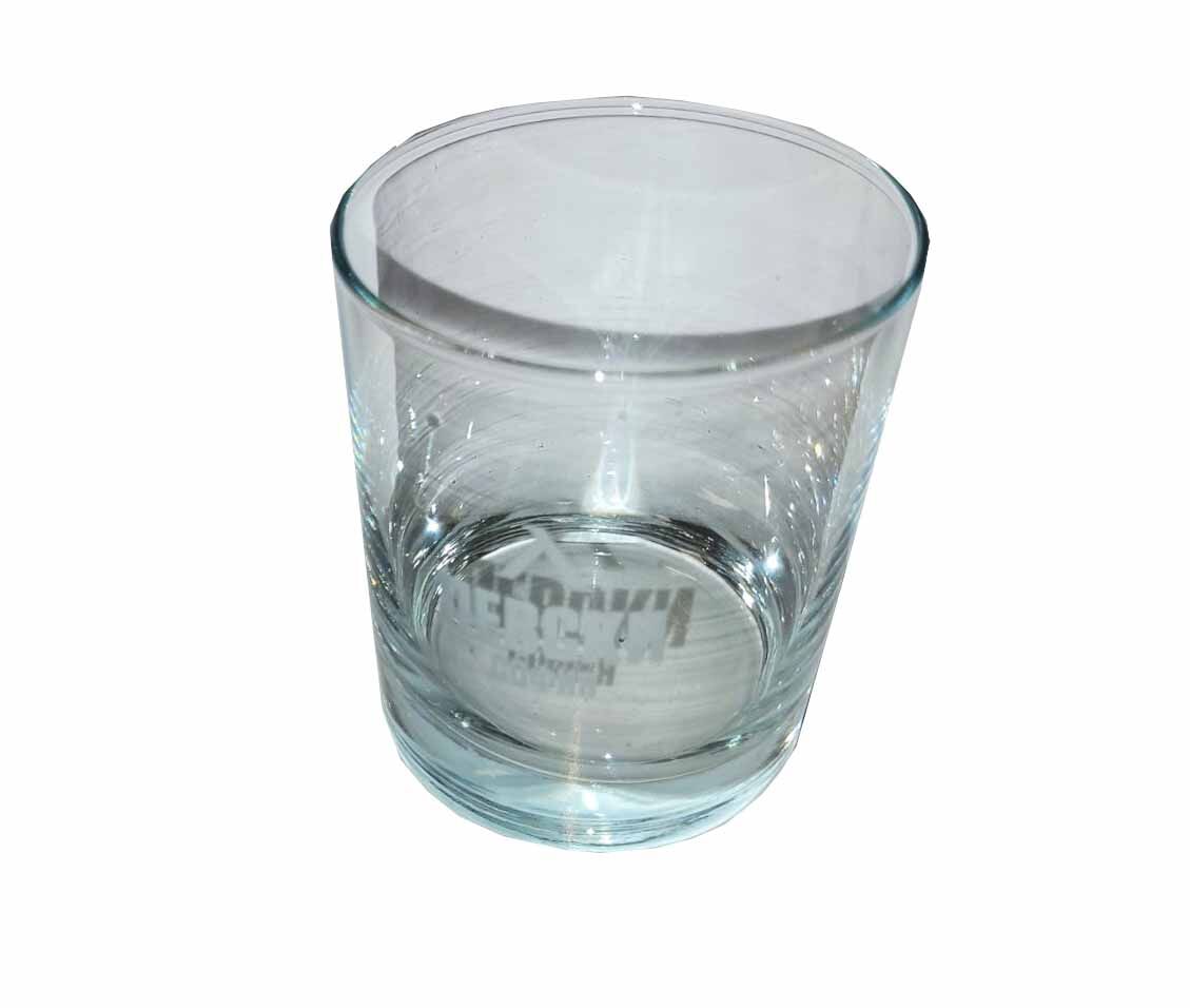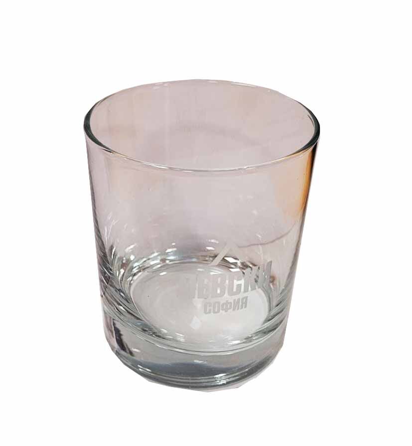 Стъклена чаша за уиски на Левски с гравирана емблема и надпис.