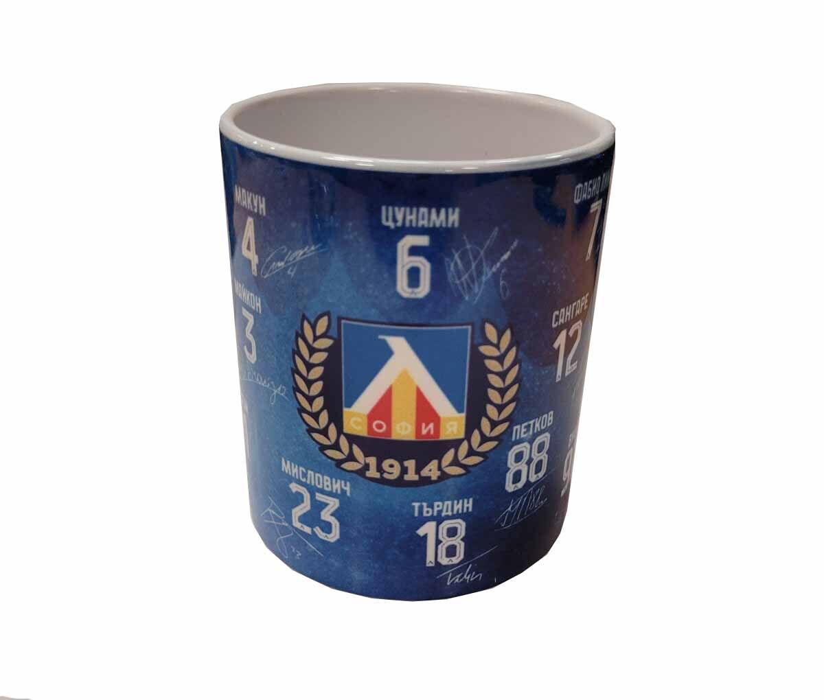 Колекционерска порцеланова чаша на Левски,с номерата имената и подписите на играчите от сегашния отбор на Сините.