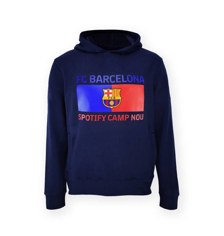 Цвят тъмносин с емблема на синьо/червен фон и надпис Спотифай Камп Ноу.