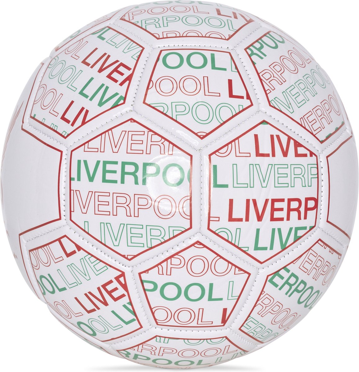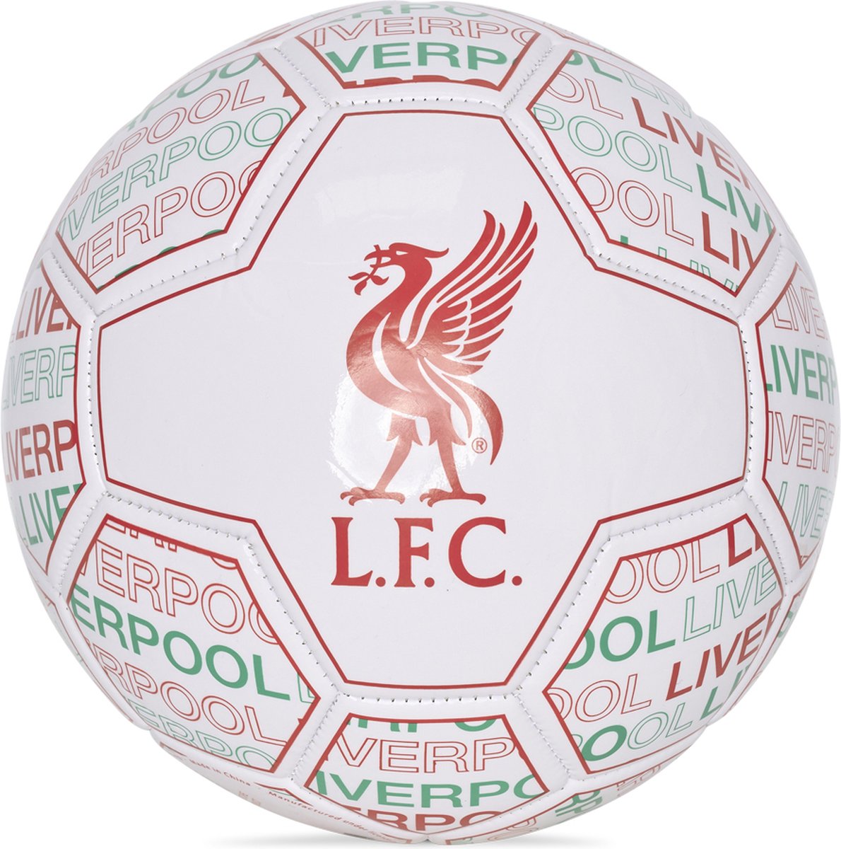 Футболна топка на Ливърпул бяла с червени надписи и емблема.