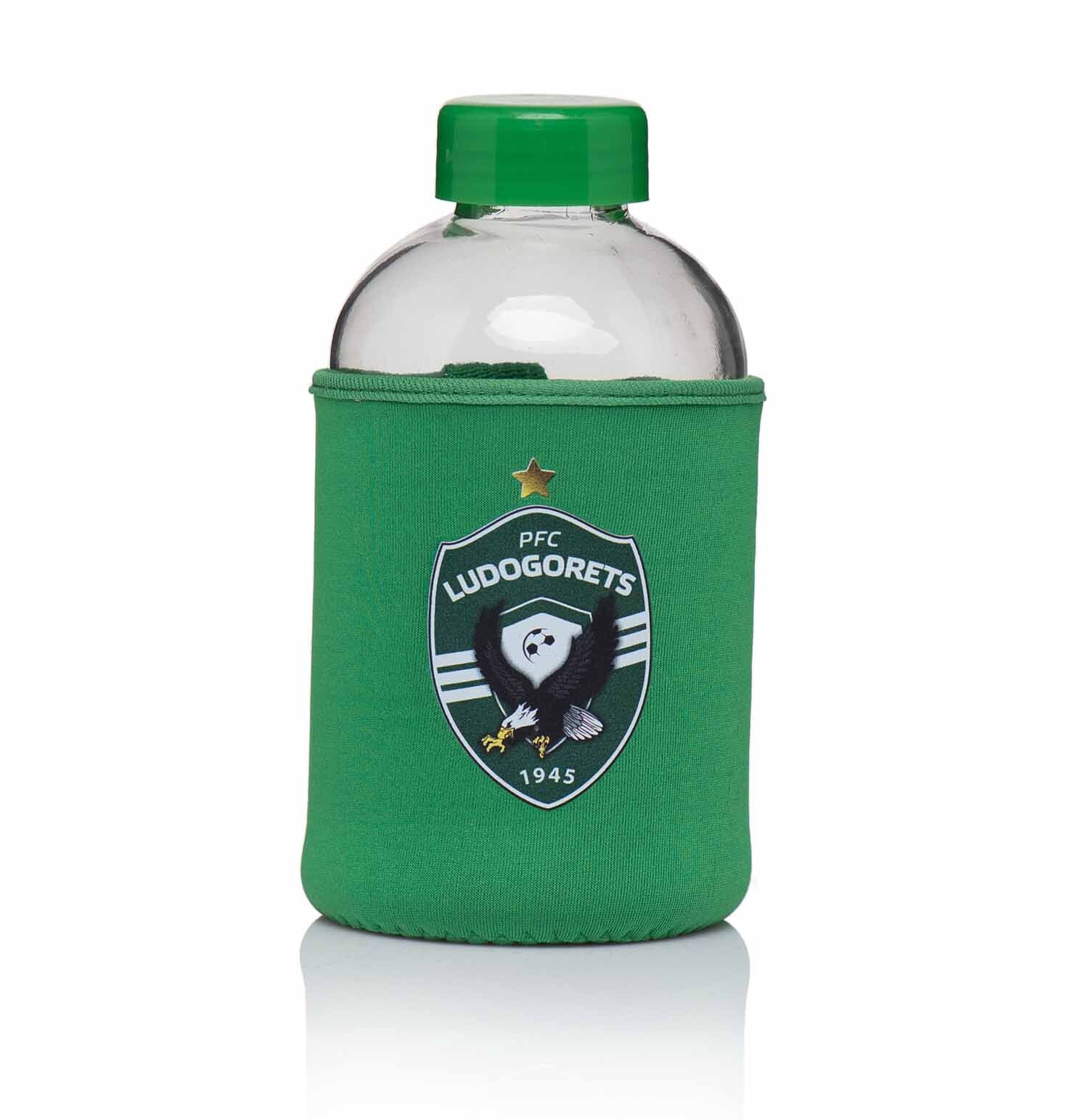 Стъклена бутилка за вода на Лудогорец с калъф от плат.