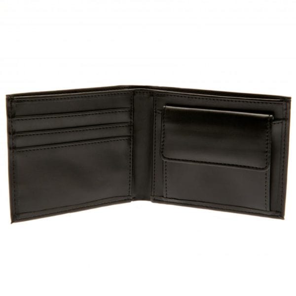 Черен кожен портфейл на Манчестър Сити с отпечатана емблема.