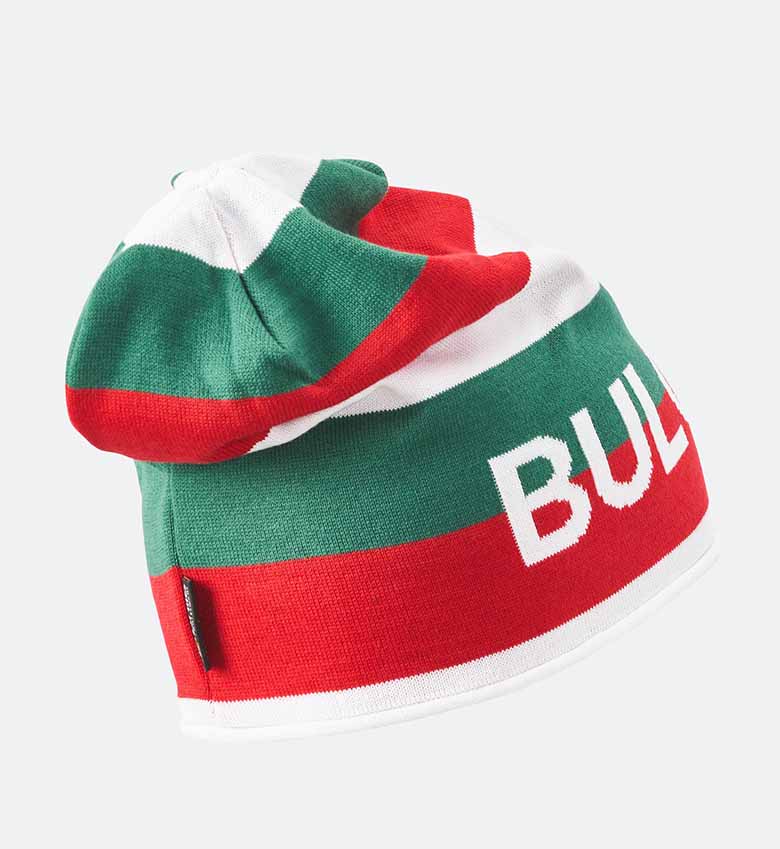 Плетена шапка с надпис BULGARIA на фона на националния трикольор.