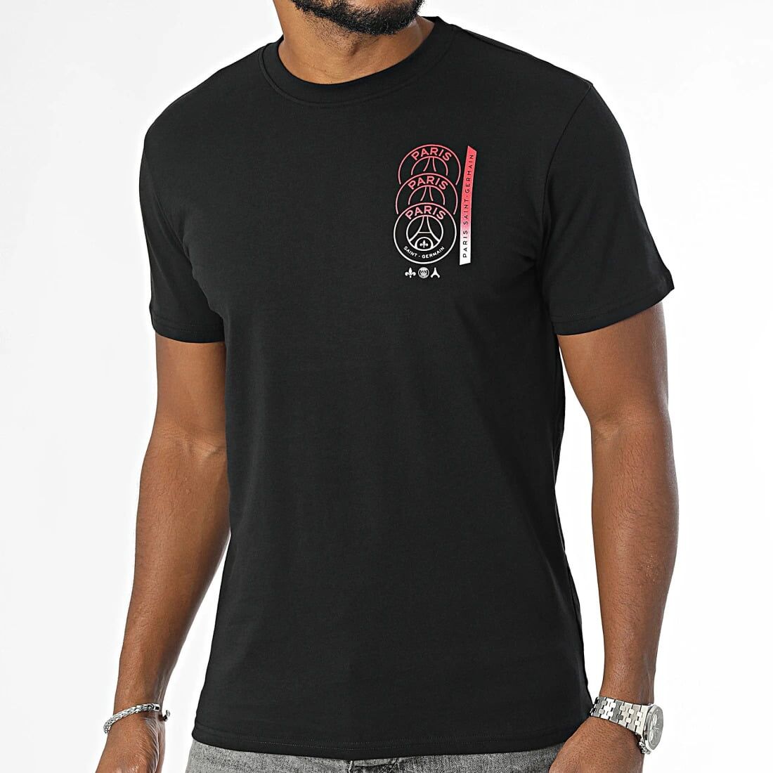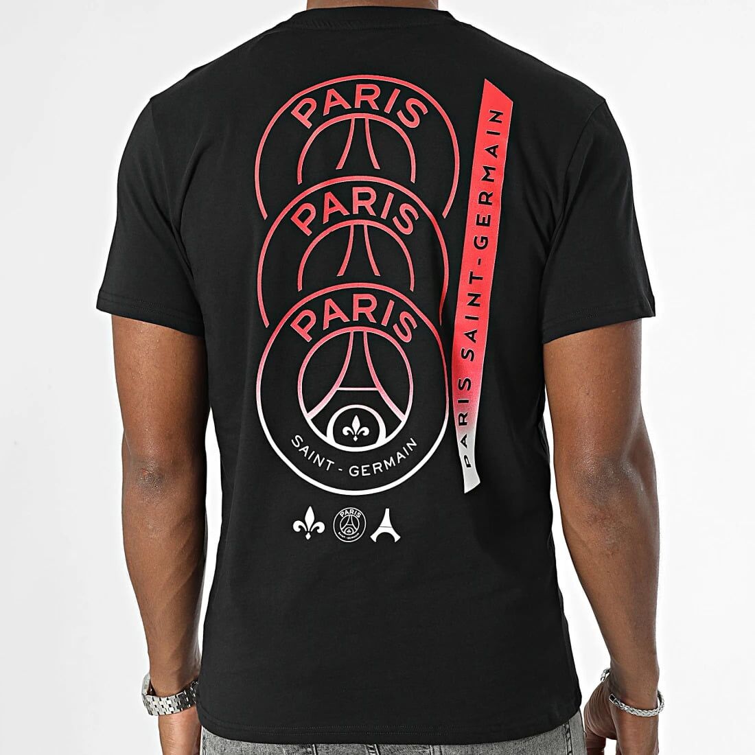 Черна тениска на ПСЖ с тройна емблема отпред и на гърба.