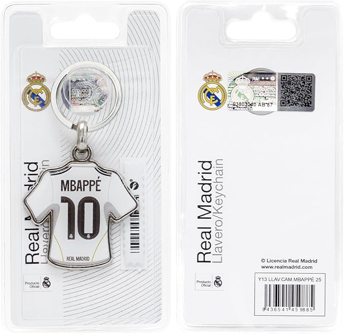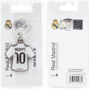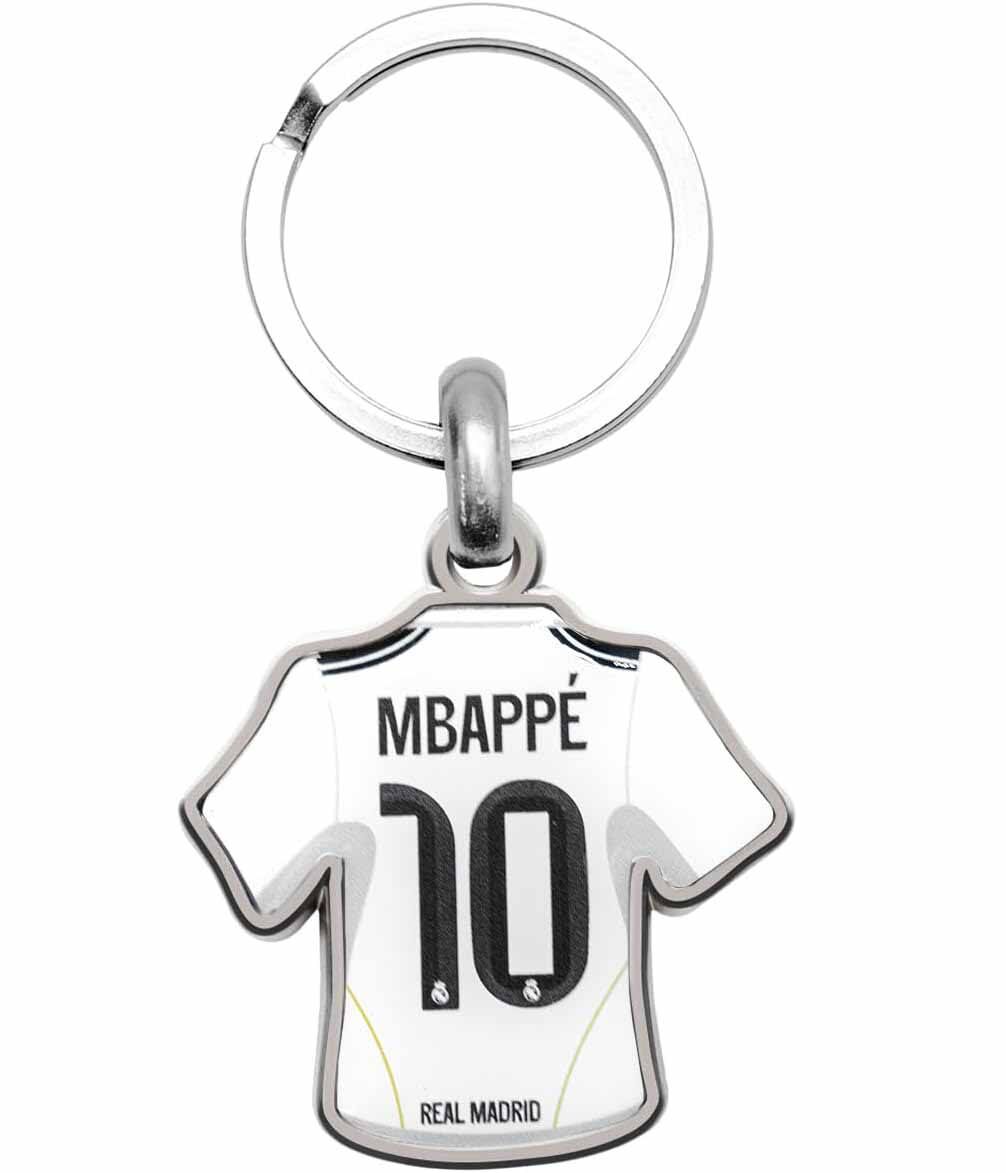 Метален ключодържател на Реал Мадрид с формата на футболна тениска с надпис Мбапе 10.