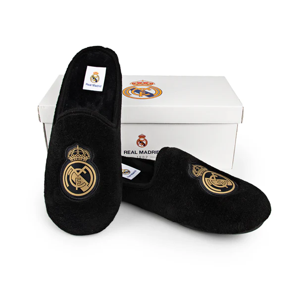 Луксозни пантофи на Реал Мадрид-черни със златиста емблема.