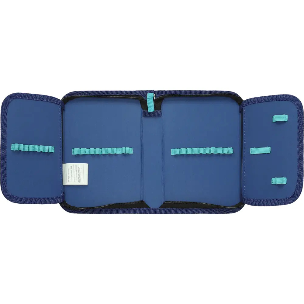 Плосък с формата на книга и малки ластичета за поставяне на моливи и химикалки.